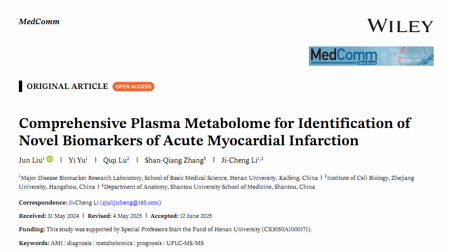 近日,李继承教授课题组在《MedComm》杂志(IF 10.7,一区Top)在线发表了题为“Comprehensive Plasma Metabolome for Identification of Novel Biomarkers of Acute Myocardial Infarction”的文章。李继承教授为唯一通讯作者,博士后刘俊为第一作者。Betway必威西汉姆联为第一完成单位和第一通讯作者单位。