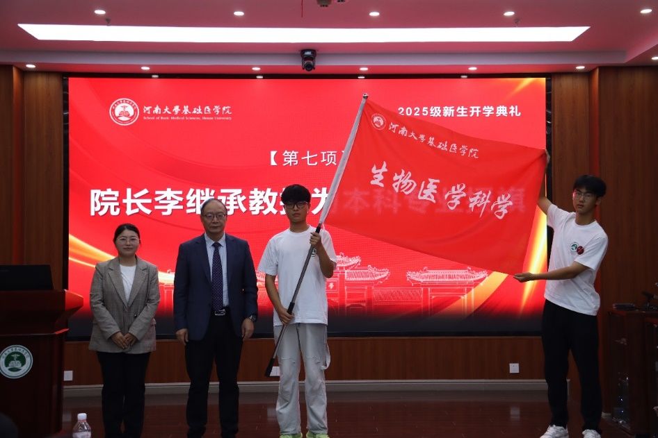 典礼上,李继承院长为生物医学科学新专业授旗。这一庄严仪式不仅象征着新专业的全面启航,更体现了学院对医学人才的殷切期望;飘扬的旗帜寓意传承与开拓,激励师生共同肩负起推动生物医学创新、服务健康中国使命的责任与担当。