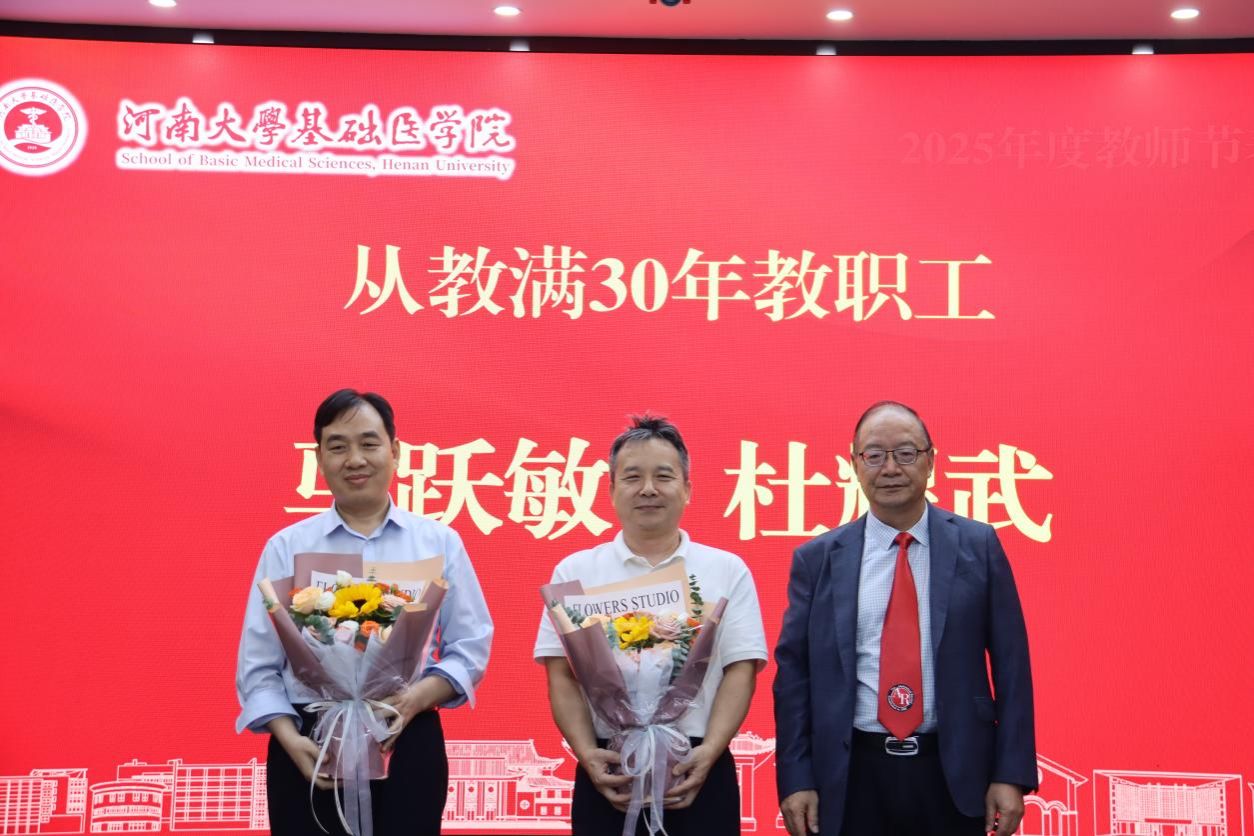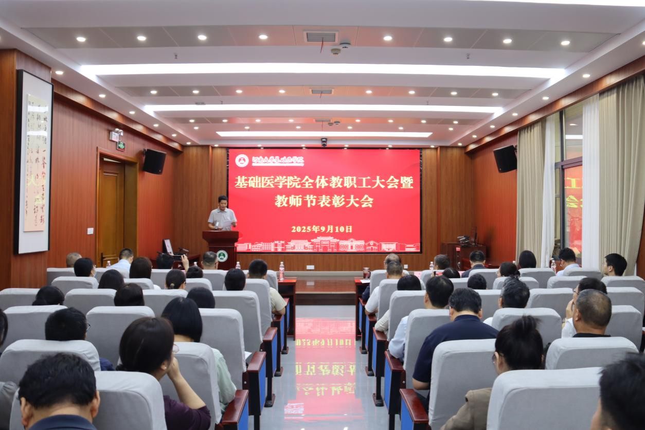 李继承院长发表致辞。他首先向为学院事业发展辛勤付出的全体教职工致以节日的诚挚问候。李院长全面回顾了自2024年学院教师节表彰大会以来,学院围绕“提质进位”这一主题,扎实推进“十项重点任务”所取得的显著成绩。他指出,学院聚焦人才培养、科学研究、服务社会等三大高校核心职能,引领全体教职工为实现学校“双一流”实干苦干。2025年以来,成立基础医学学科建设咨询委员会(浙大、中山大学、中南大学等9位专家委员);获批2025年国家自然科学基金6项,其中面上项目3项(获批数量增幅50%,中标率达21%);获批国家级一流本科课程2门(医学免疫学和组织学与胚胎学);新增生物医学科学本科专业并迎来首届本科新生;承办“第十届中国转化医学大会暨中国精准医学大会”;成功举办由我们发起,北大、浙大、复旦等84所高校研究生参加的首届“全国研究生学术创新与成果转化大赛”;在国家级科创大赛中,斩获3金、7银、11铜等奖项;加速推进粤港澳转化医学研究院建设,成立粤港澳转化医学研究院医院学科建设联合体,成功举办2期医院管理干部和科研能力培训班,共建高水平医学学科。同时,李院长对开学至今2025级新生报到工作的高效完成、新学期教学运行平稳有序、平台建设和科研工作顺利开展表示充分肯定。立足当前,展望未来,“强理振文、新工新医”,李院长重点阐述了学院发展规划,强调要扎实推进“强基-提升-腾飞”科学跨越式发展三步走战略,认真落实三个“3年”规划,以多项务实举措助力学院高质量发展,更好服务学校“双一流”建设目标。