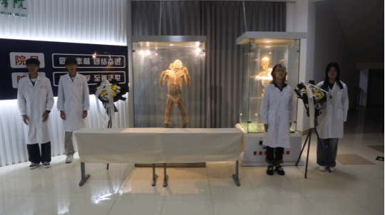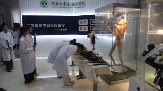 在默哀仪式圆满结束后,身着白色大褂的同学们,手捧秋菊,向医学生最为敬重的无言良师——“大体老师”敬献鲜花,以示最高的敬意。