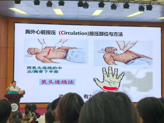李老师逐步演示了四大急救技术的关键操作。主要包括:(1)心肺复苏:意识判断、胸外按压的深度与频率,以及AED的正确使用方法;(2)人工呼吸:展示了开放气道、有效吹气和相关注意事项;(3) 异物梗阻:展示了海姆立克急救法的标准动作;(4)模拟伤口:讲解了直接压迫止血和绷带缠绕技巧,帮助听众迅速掌握实用急救要领。讲解结束后,李老师立即组织学生分组开展急救实操练习。各组学生围绕心肺复苏按压、人工呼吸配合、海姆立克冲击及止血包扎等技能,在模拟人、道具上反复演练,老师巡回指导,及时纠正动作偏差,确保学生切实掌握急救操作要领。
